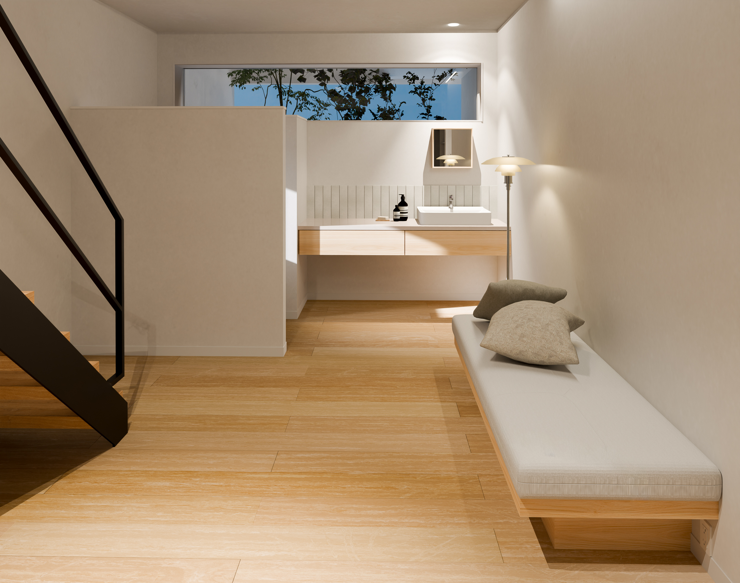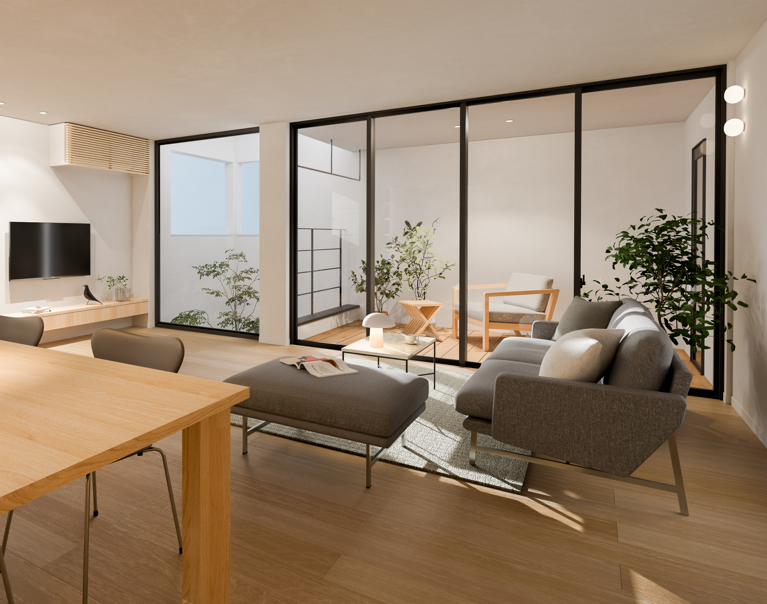 SE構法ならではの約30畳の開放的なLDKには「囲い庭」が設けられ、高木の植栽が四季を感じさせる空間となっています。