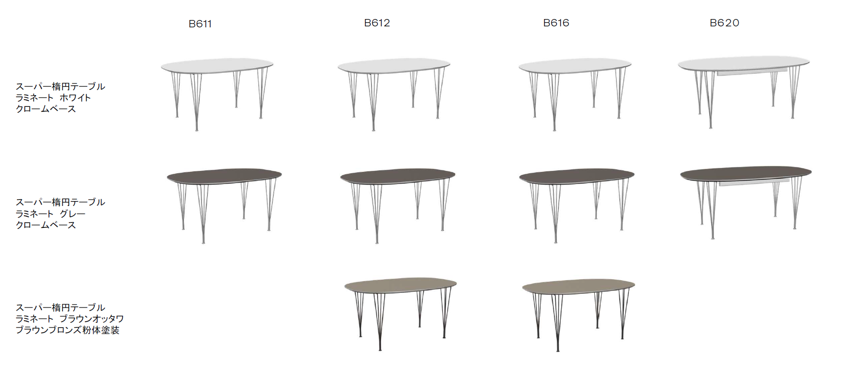 コンパクトな6脚対応のB612モデルは、日本の住空間にも取り入れやすいバランスの良いサイズです。日常使いからホームパーティーまで幅広く活躍します。さらにゆったり座れる6脚対応のB616モデルは、ゆとりあるサイズ感で家族やゲストが自然と集う住まいの中心となるダイニングに最適。円形のフォルムが、自然と会話が生まれるオープンで親しみあふれる空間を生み出します。B620モデルは、椅子6〜10脚がすっきりセットできる延長式テーブルです。明確な上座・下座が存在しないため、オープンで親しみあふれる集まりはもちろん、効率的な仕事用のデスクや友人や家族と囲む食卓としても最適です。
