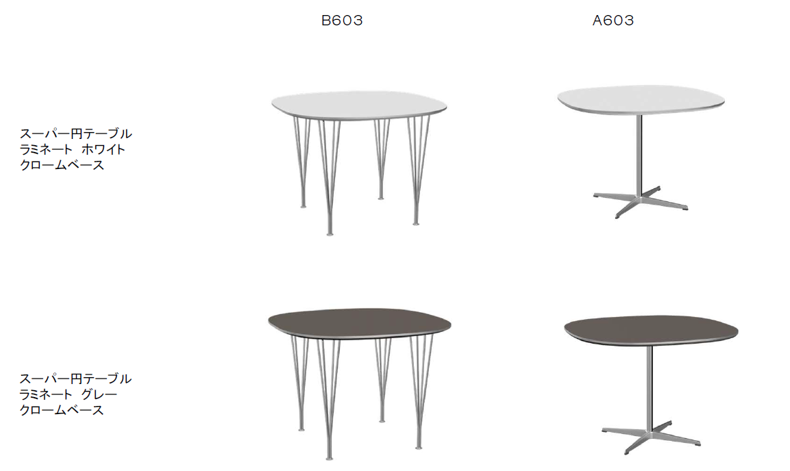 存在感が魅力のB603モデルのスーパー円テーブルは、空間に自然と溶け込む控えめでありながら印象的なデザインが特徴です。取り外し可能なスパンレッグ仕様のモデルもあり、4脚のチェアを配置してもゆとりある足元空間を確保。日常の食事から来客時まで、心地よく会話が弾むダイニングシーンを演出します。さらに、アルネ・ヤコブセンがデザインした4スターベースとの美しいシンメトリーが際立つスーパー円テーブル(A603)も対象。洗練されたベースデザインは、2脚をセットしてもゆとりある足元空間を確保し、コンパクトな住まいでも快適なダイニング体験を叶えます。