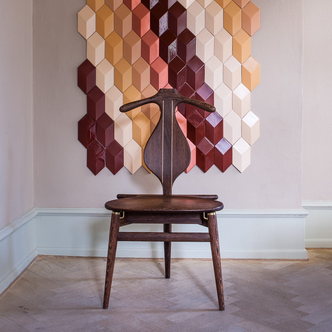 1951年、衣服の美しい収納を考える対話から生まれた「ヴァレットチェア」。試作を経て完成した3本脚の構造は、実用性と造形美を両立しています。背はジャケットハンガー、跳ね上げ式の座面はパンツを整える機能を備え、小箱も付属。異なる木材を組み合わせた意匠にも、素材へのこだわりが表れています。